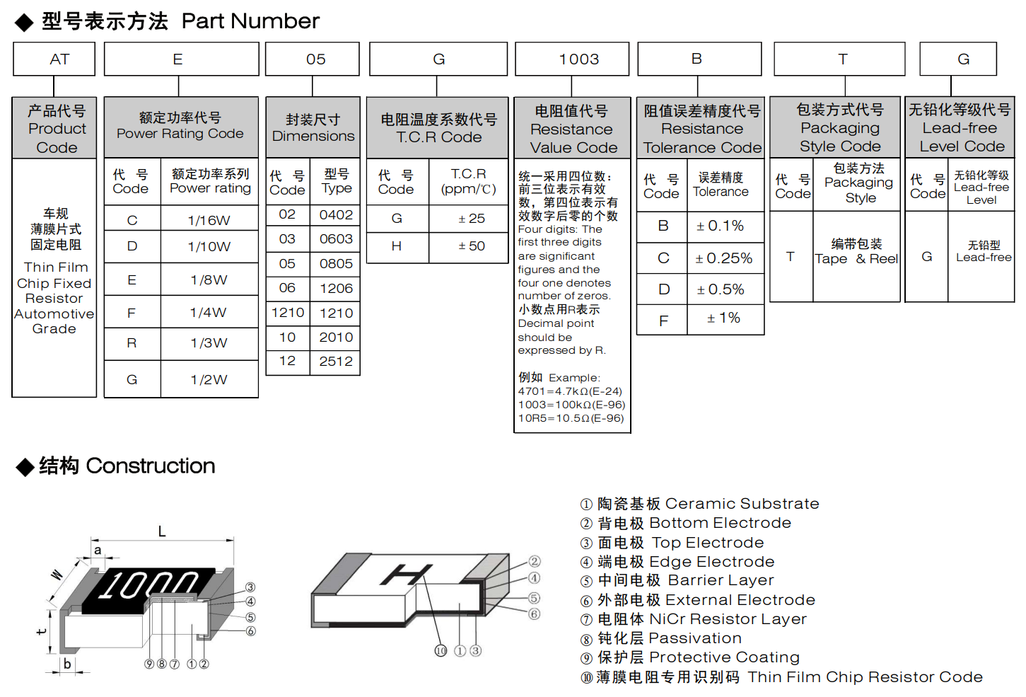 车规薄膜片式固定电阻器符合AEC-Q200汽车标准相关条款电温度系数(±25ppm/℃;±50ppm/℃)及高精度(±0.1%~±1.0%)适应再流焊与波峰焊符合RoHS指令要求具有抗硫化性能特殊钝化材料,具备良好的耐湿性、耐腐蚀性、高可靠性